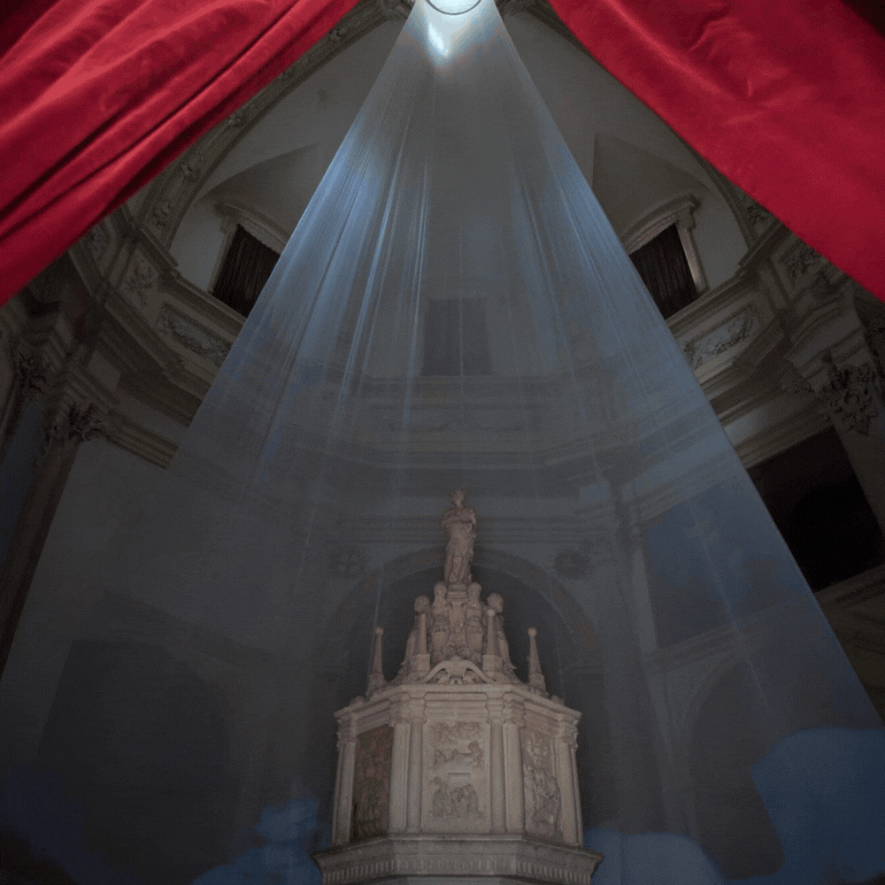La mostra digitale allestita nell’ex Battistero della Manna d’Oro è una testimonianza della complessità dell’opera di restauro, compiuta da esperti artigiani locali vincitori di un bando pubblico del Comune di Spoleto. Nell’allestimento della mostra niente è stato concepito come corporeo: un fascio di luce irrompe dalla lanterna posta al culmine della cupola, sugli schermi scorrono immagini di spettacoli passati andati in scena nel teatro, mentre le immagini sulle pareti documentano i lavori. Anche il grande libro fotografico, consultabile dal visitatore, è un’installazione virtuale. Già nel 2011 è stata presentata la rimessa a nuovo del foyer del teatro, mentre il lavoro è poi continuato sulla "Camera Ricca", l’articolata scenografia dell’architetto Giovanni Mottironi realizzata intorno al 1874, costituita da quinte multiple che inquadrano il fondale. Questa fuga prospettica tipica della scenografia italiana è rappresentata da una serie di drappeggi con passamanerie dorate, anch’esse soggette a restauro, così come le armature lignee originali. Anche il sipario dell’Apoteosi di Caio Melisso di Domenico Bruschi (1879) raffigurante le Arti e la Poesia, aveva necessità di recuperare l’integrità della superficie pittorica per essere riportato alla sua originaria funzionalità compromessa dall’uso ed è stato restaurato ridando solidità alla tela con interventi di reintelaiatura sulla parte posteriore.