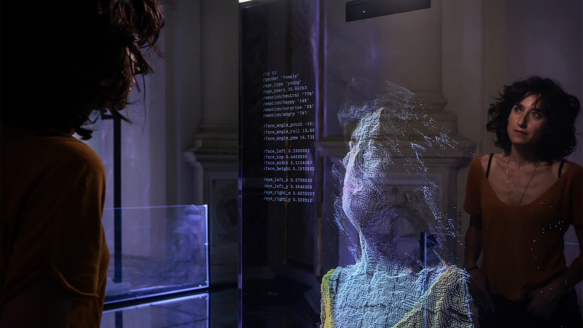 In un ambiente immersivo e contemplativo, l'installazione Neural Mirror progettata dallo studio di interaction design Ultravioletto, viene percepita inizialmente come un insieme di totem specchianti, grazie a una particolare pellicola che ricopre gli schermi. Posto di fronte allo specchio, il riflesso della persona si oscura e l’immagine del visitatore lascia presto spazio a effimere nuvole di punti color arcobaleno, generate dall'intelligenza artificiale tramite un algoritmo di riconoscimento facciale, che scansiona e interpreta la figura umana, rendendo la sua visualizzazione da parte dell'IA co-creatrice dell'installazione. Il corpo è ora un’immagine composta da un flusso di dati: sesso, riferimenti demografici, stato emozionale, attraverso due grandi plotter alti 4 metri e mezzo prendono forma e significato diventando informazioni trascritte a ciclo continuo su un rullo di carta, che si accumula nelle nicchie della chiesa, rendendo tangibile il volume dei dati stampati dalle macchine, simili a “scribi computerizzati”. I dati compongono una sorta di identikit fisico ed emozionale, come singole stringhe di codice, e vengono così immessi nel grande flusso della rete, ma in modo ben definito e visibile dal visitatore, che può comprenderli in tempo reale nella loro interpretazione artistica.