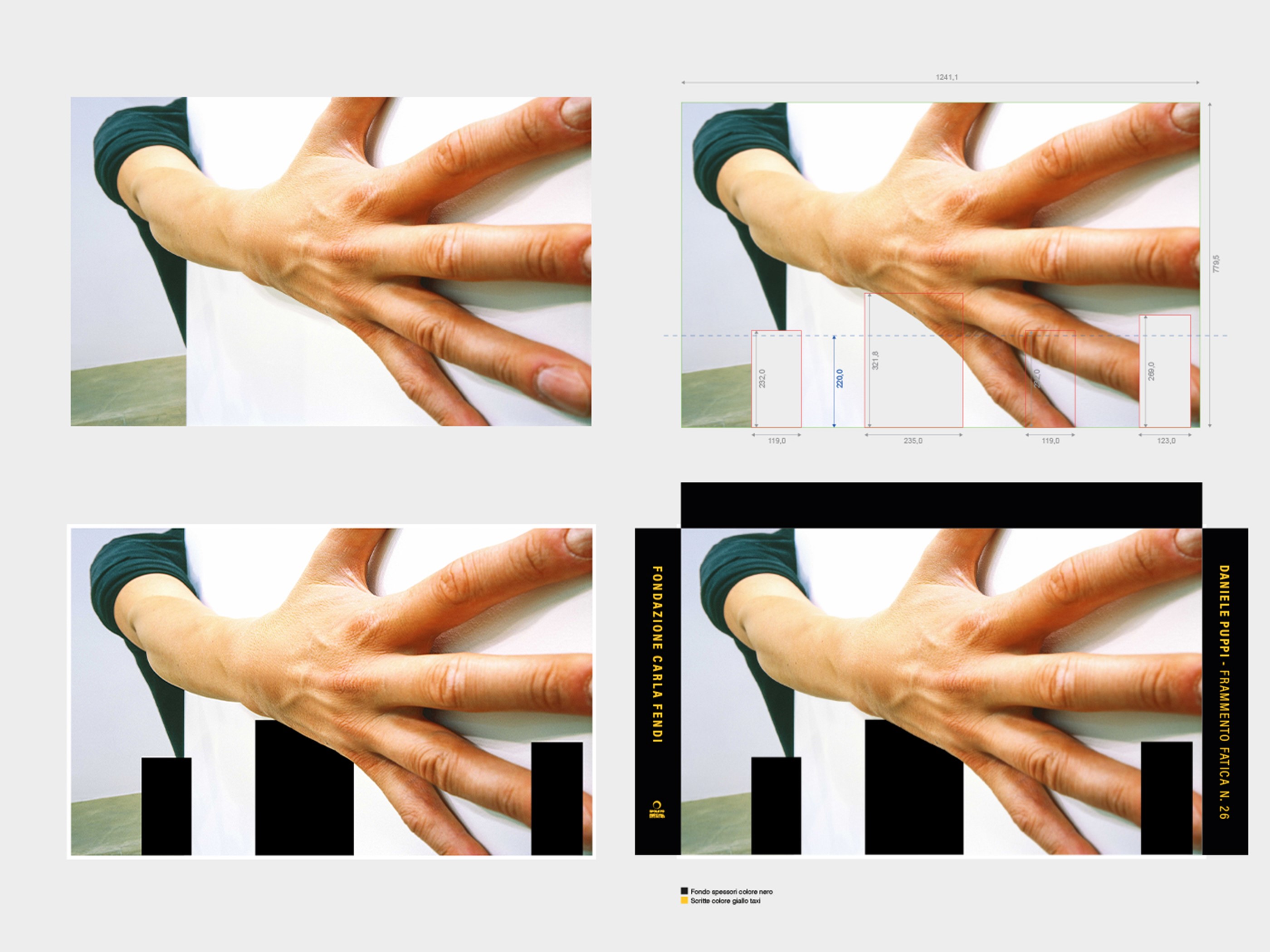 Frammento Fatica n. 26, installazione site-specific commissionata da Carla Fendi Foundation, è la rielaborazione in formato wall-drawing di un lavoro fotografico di Puppi del 2004. Come richiesto dalla Fondazione, l’opera ha coperto per tutta la durata di Spoleto65 Festival dei Due Mondi la facciata del seicentesco teatro Caio Melisso Carla Fendi.