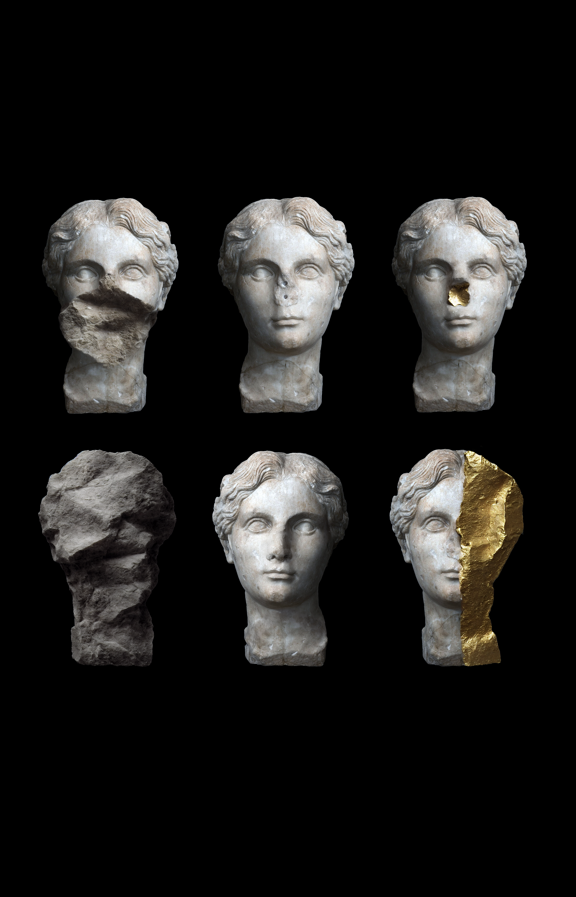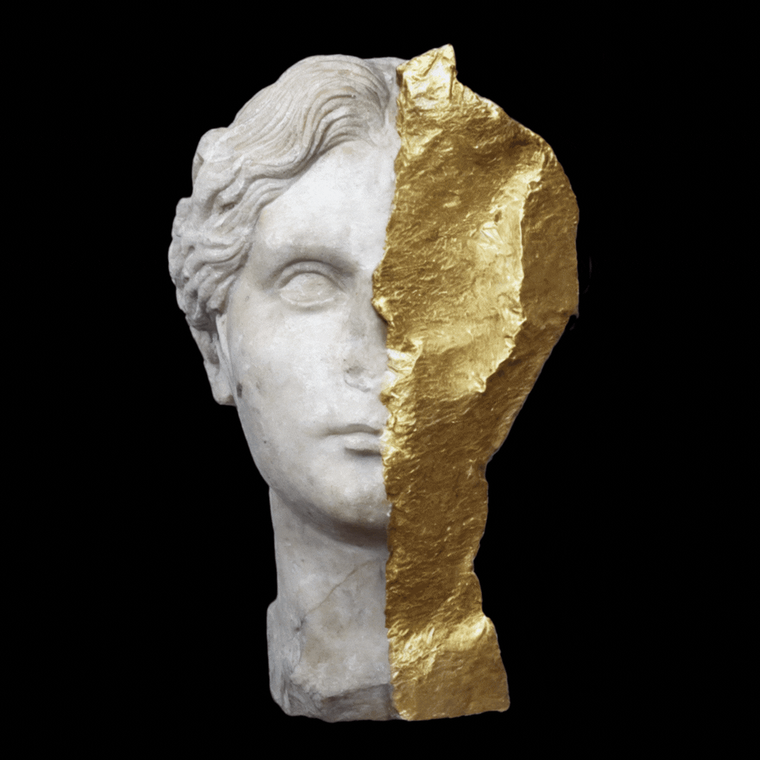Gianni ha dunque inteso creare strumenti di analisi delle statue antiche che permettessero di ricercare il rapporto aureo nelle proporzioni dei volti, identificare pose o evidenziare differenze nei materiali marmorei attraverso l’AI. Un processo di ricostruzione generativa in cui l’unico elemento integrato dall’artista nella pietra è l’oro.