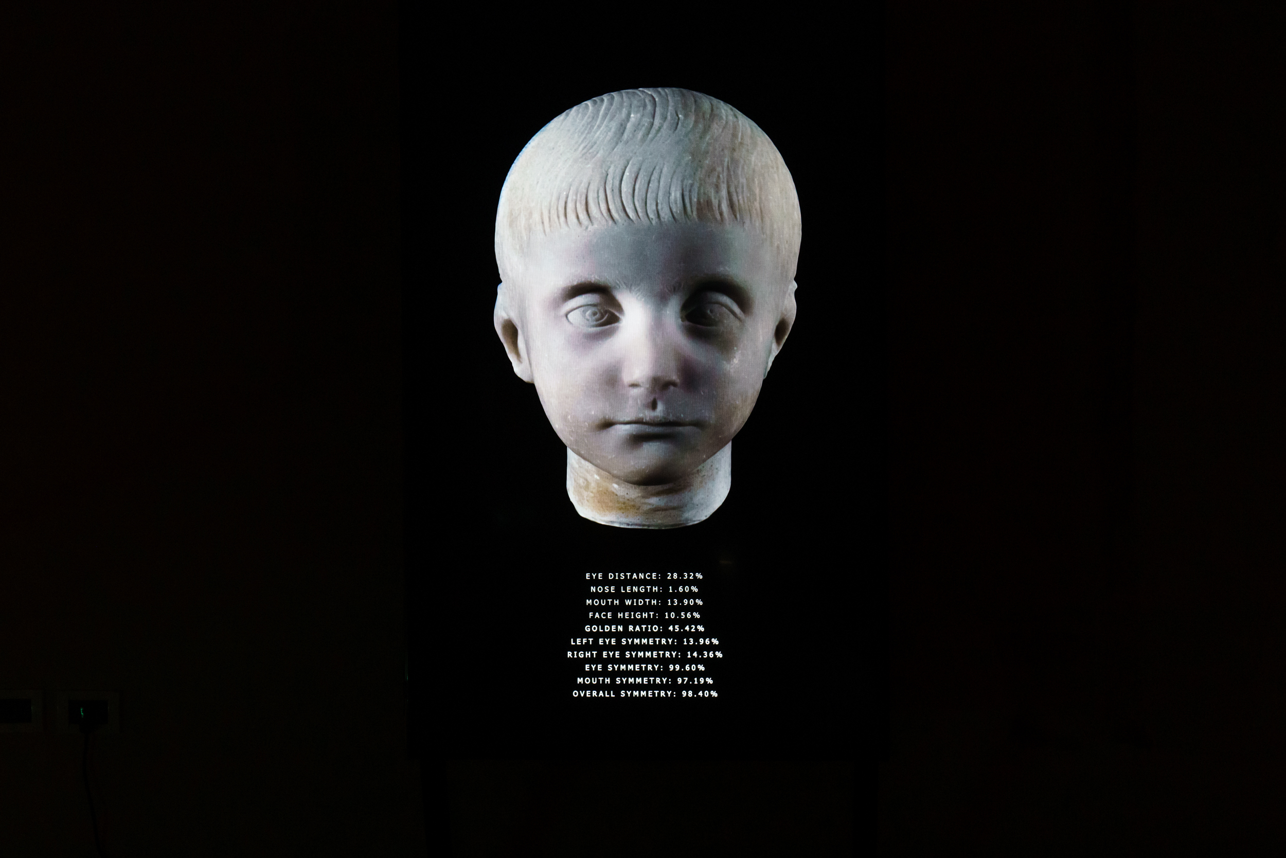 Volti in pietra dalle collezioni Palazzo Altemps. L’artista ha realizzato strumenti di analisi dei rapporti geometrici nei ritratti scultorei attraverso il riconoscimento facciale e strumenti generativi per la ricostruzione delle parti mancanti. Il primo volto che vediamo è l’originale, il successivo la sua ricostruzione AI. I dati sovraimpressi segnano la distanza di occhi, bocca, naso, l’altezza del volto, il rapporto aureo e i dati di simmetria. Usando l’AI come metastrumento l’artista ha creato mezzi di analisi e ricostruzione che ha messo a disposizione del museo.