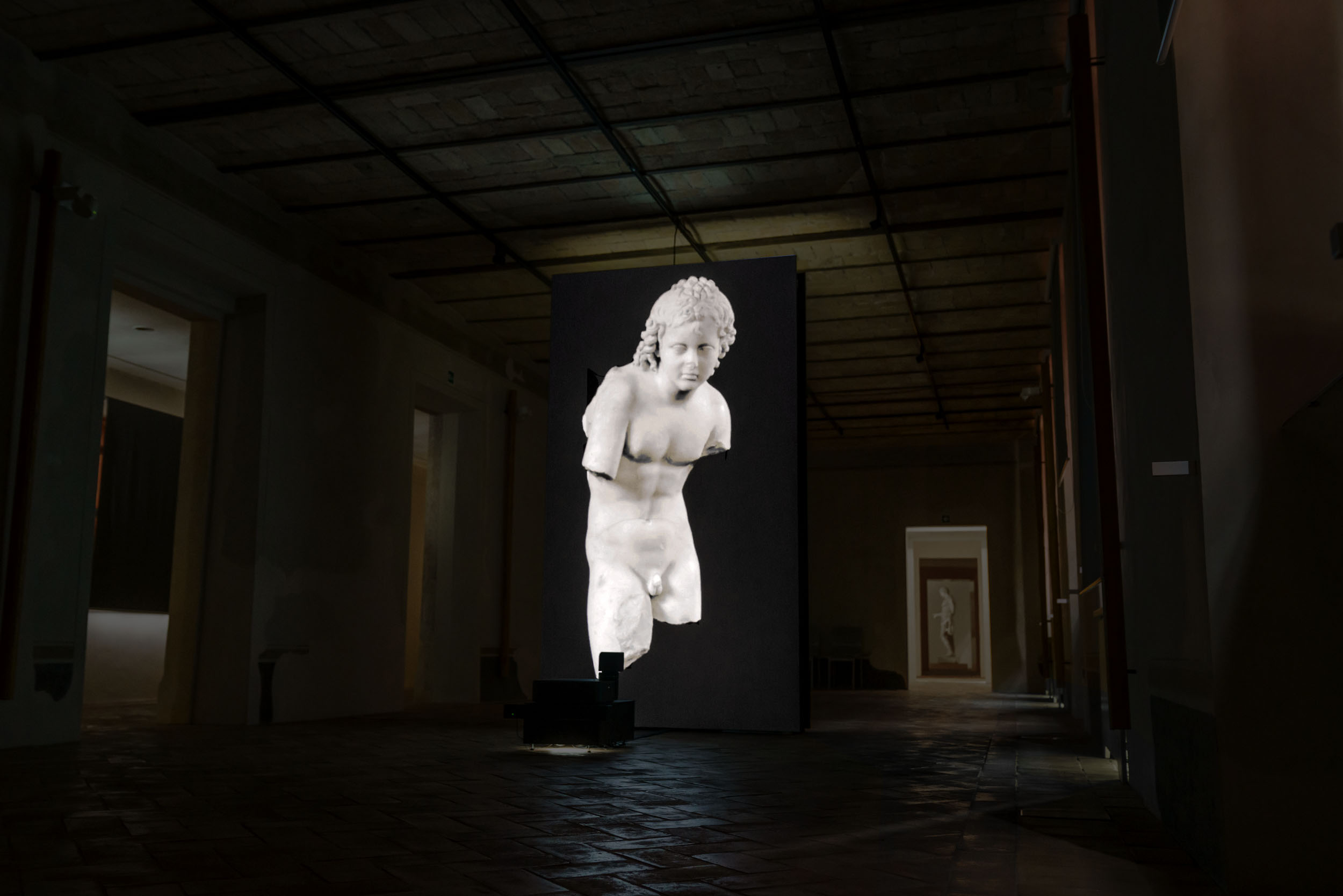 L’artista ha sviluppato due modelli di Intelligenza Artificiale, addestrati specificamente sui dati del Museo: il primo ricostruisce le parti mancanti dei ritratti antichi, aggiungendo dettagli a volti frammentari e restituendo lineamenti andati perduti con il passare del tempo. Il secondo, addestrato sulle statue marmoree, attiva un processo diametralmente opposto, che accelera la trasformazione della pietra, permettendo di intuire l’emergere e lo svanire della forma scultorea.