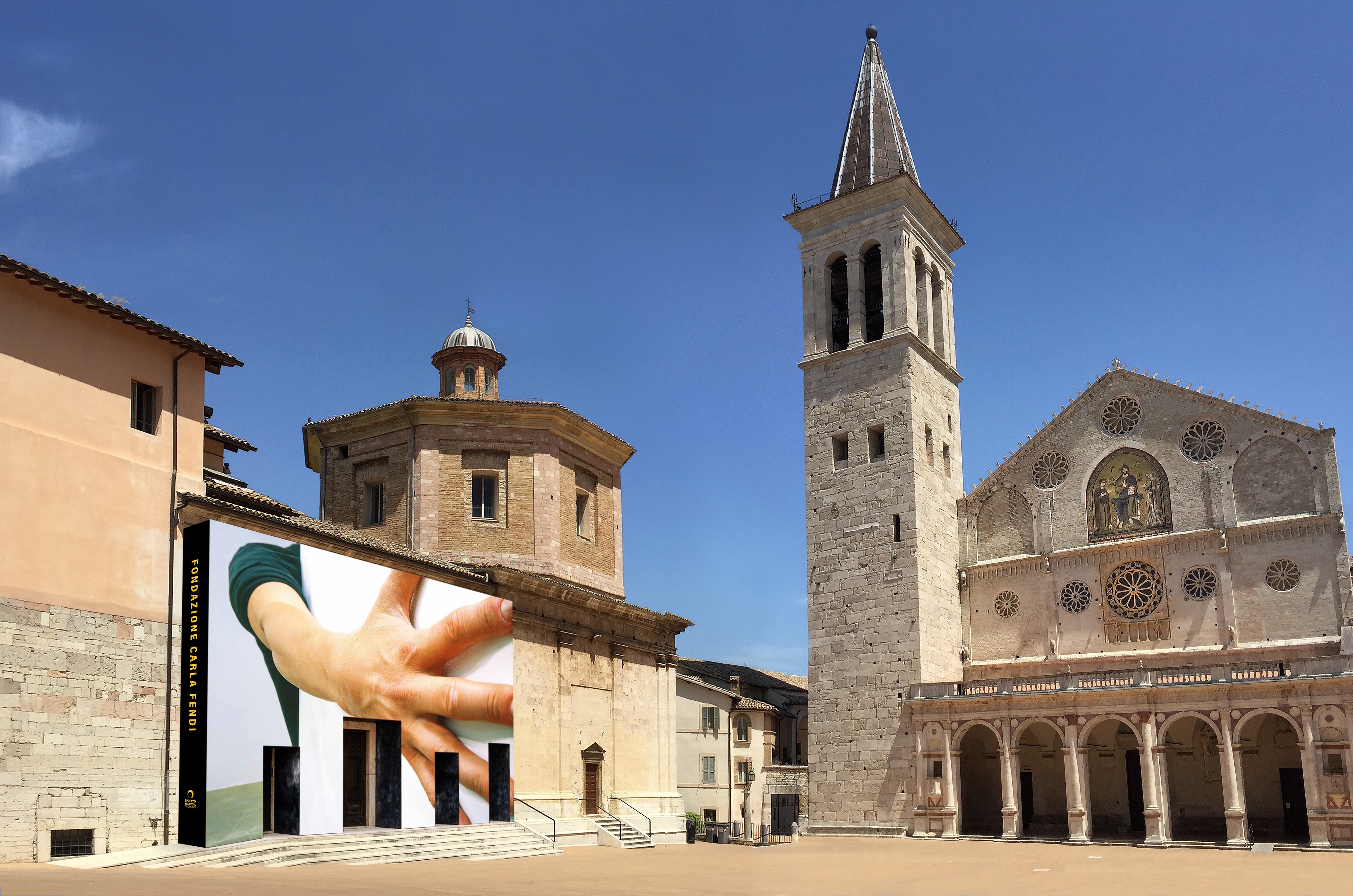 Daniele Puppi's large installation Frammento Fatica n.26 is part of ArTificial ArTechnology, the event project commissioned and produced by the Carla Fendi Foundation for the Spoleto65 Festival dei Due Mondi. The large wall-drawing, which completely covered the façade of the Caio Melisso Carla Fendi Theatre on Piazza Duomo, in the heart of Spoleto's historic center, was conceived as a reworking of a three-dimensional photographic work that Puppi created in 2004, in four copies, for the Lisson Gallery in London. The gigantic hand of Fragmento Fatica n.26 seems to be trying to support the theater's façade. The artist chose to re-present the work in an oversized version, which in its site-specific setting takes on a new and different connotation. Puppi works by interacting with space and moving within Euclidean coordinates. Conceived as a true work in regress, Puppi's work was born after a gestation period spent within the spaces, during which the artist experiments with the environment and establishes a relationship with it through which he evaluates its limits and potential.