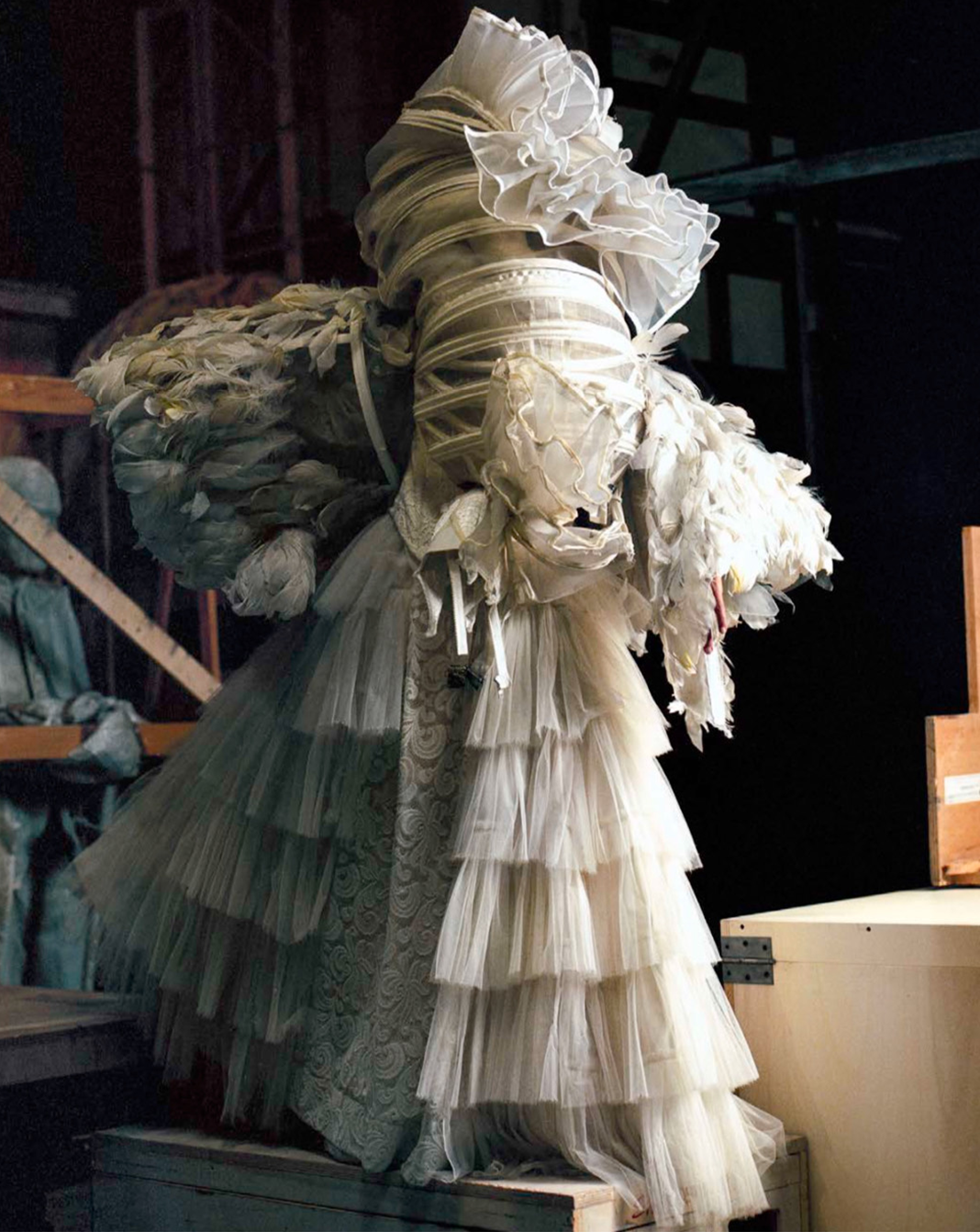 The exhibition was presented during Spoleto67 Festival dei Due Mondi at the former church of the Manna d’Oro in Piazza Duomo, Spoleto, a 17th-century baptistery often used by the Carla Fendi Foundation to host its cultural projects. Invited to respond to the prestigious and recently established costume archive of the Spoleto Festival dei Due Mondi, Rodriguez and Zamara selected costumes from historic operas and ballets, combining them in unexpected and elaborate ways, to emphasize and assess the way dress defines identity. Capturing the flare and detail of the original costumes whilst placing them in new situations referencing fashion, Rodriguez, who trained as a dancer and performed worldwide before turning to photography, presents his subjects as other-worldly entities with costumes as body-surrogates. Each models' movements – burdened or empowered – aligns their capacity for expression with the performativity of the dress.