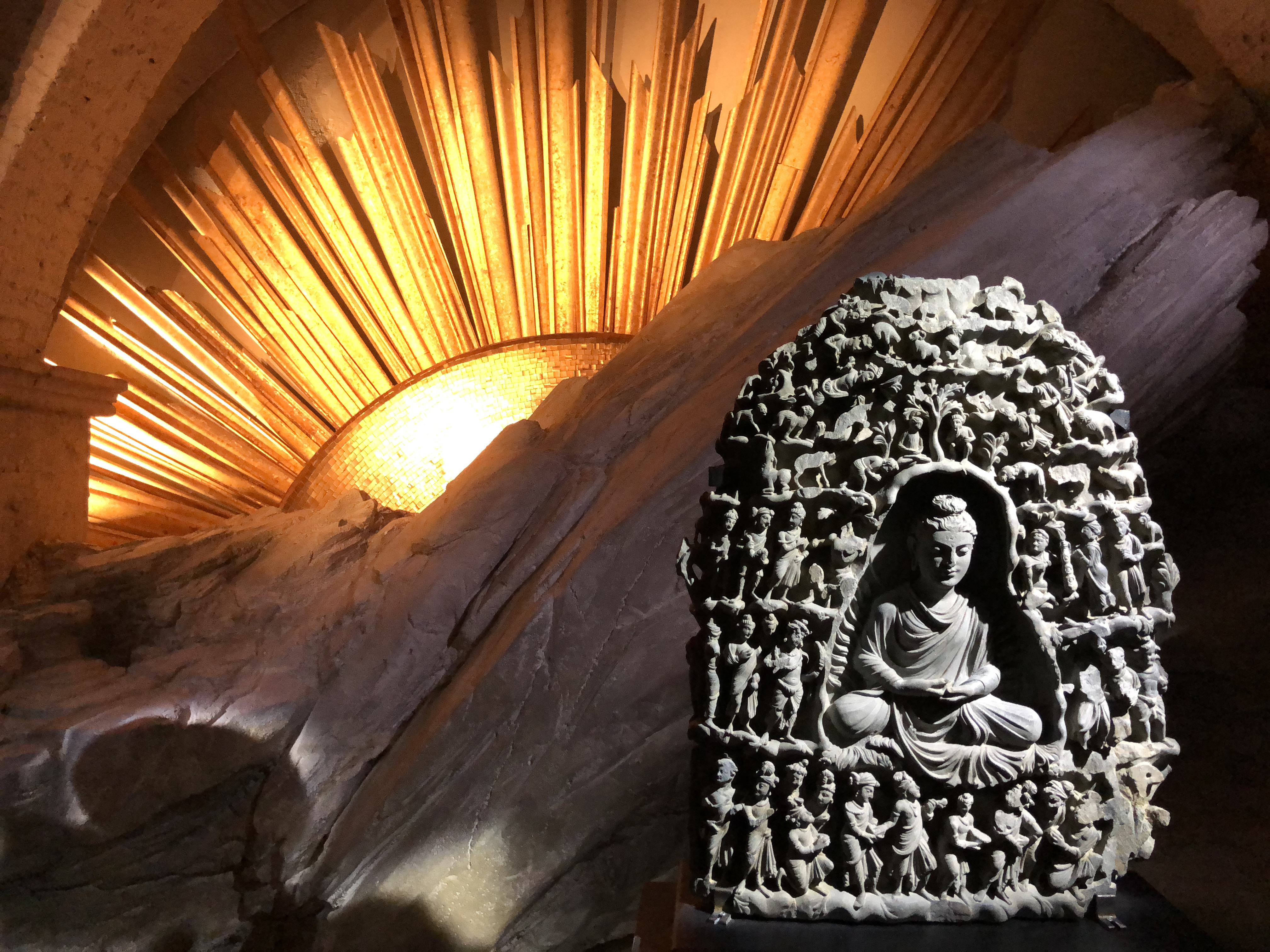 Myths and Transfigurations is part of the project The Mystery of Origin. The installation was curated by Quirino Conti, with scientific consultancy by Marco Galli and Laura Giuliano. The Oriental and Occidental worlds - even through culturally and philosophically antithetical contexts - were able to generate a universal heritage of human knowledge, rooted in the need for both spirituality and rationality, mysticism and materialism. Conceived as a timeless cave, the installation evokes both Plato’s allegory of the cave and the Indian notion of the “Passage,” according to which the Supreme Principle shines within the secret darkness of the grotto. Within this space, ancient East Asian schists (2nd–4th century AD), belonging to the art of Gandhāra — an area corresponding to present-day northern Pakistan and eastern Afghanistan — were exhibited. These include precious representations of meditating Buddhas and Bodhisattvas, from the collections of the Museo Nazionale di Arte Orientale Giuseppe Tucci (now Museo delle Civiltà) in Rome, and from the MAO (Museo di Arte Orientale) in Turin.