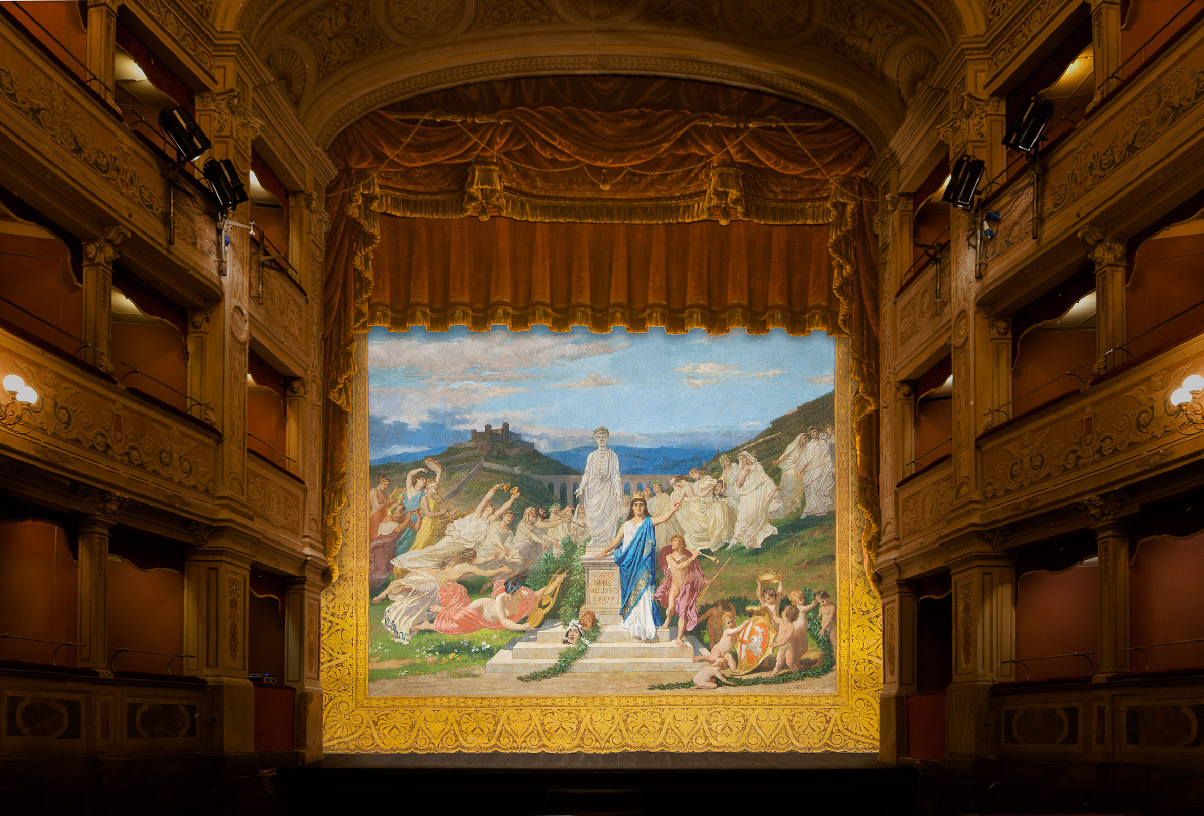 A Theatre Minute performance and an exhibition allowed the audience of the Spoleto Festival to admire the newly restored historic curtain of the Caio Melisso Theatre, depicting The Apotheosis of Caio Melisso, along with the stage setting of the so-called "Camera Ricca", including its wings, valances, and backdrops. This milestone marks a significant stage in the restoration project pursued by the Carla Fendi Foundation since 2010 to restore the theatre’s original functionality and splendor. A long-time friend of Maestro Giancarlo Menotti, a devoted attendee of the Festival of Two Worlds, and a passionate lover of theatre, Carla Fendi decided to support the restoration of the Caio Melisso Theatre through the financial backing of her Foundation. The Foundation formalized an agreement with the Municipality of Spoleto for the refurbishment of the theatre, based on a project including upgrades to the technical systems, safety improvements to the orchestra pit, and the restoration of the decorations, curtains, and historic stage wings. In tribute to its patron, the name of Carla Fendi was added to the theatre’s original name.