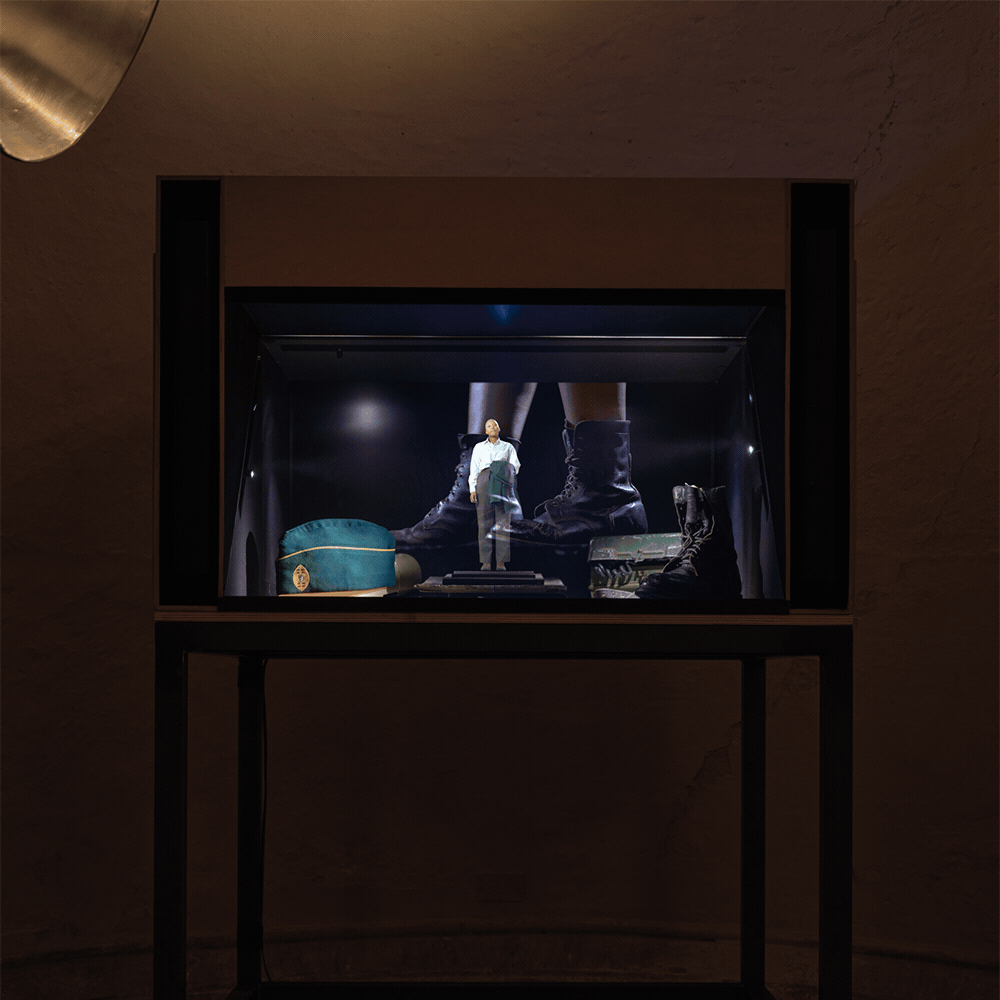 Four animated dioramas were premiered in the evocative setting of the Manna d’Oro. The artworks were developed by combining tabletop theatre and puppetry with the Victorian theatrical illusion of the “Pepper’s Ghost,” popularized by John Henry Pepper in 1862. Transposing their narratives from the stage to the miniaturized space of a diorama — a sort of box with one side open to the viewer's perspective — William Kentridge and artists Anathi Conjwa, Micca Manganye, and Sabine Theunissen used the “Pepper’s Ghost” technique in a distinctive way. The method is based on the use of half-silvered mirrors: objects or performers become visible when lit behind the glass, while images can be seen when lit in front of the mirror.